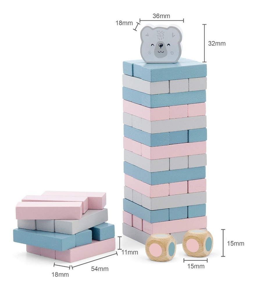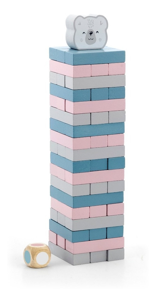 El juego estimula la motricidad fina, el equilibrio, el pensamiento lógico y la percepción del color. Está fabricado en madera, en colores suaves, con pinturas al agua.